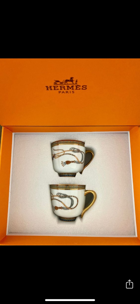 Hermes Paris imzalı beyaz ve gri detaylı kahve fincanları, şık desenlerle süslenmiş. Turuncu Hermes kutusunda sunulur. ☕