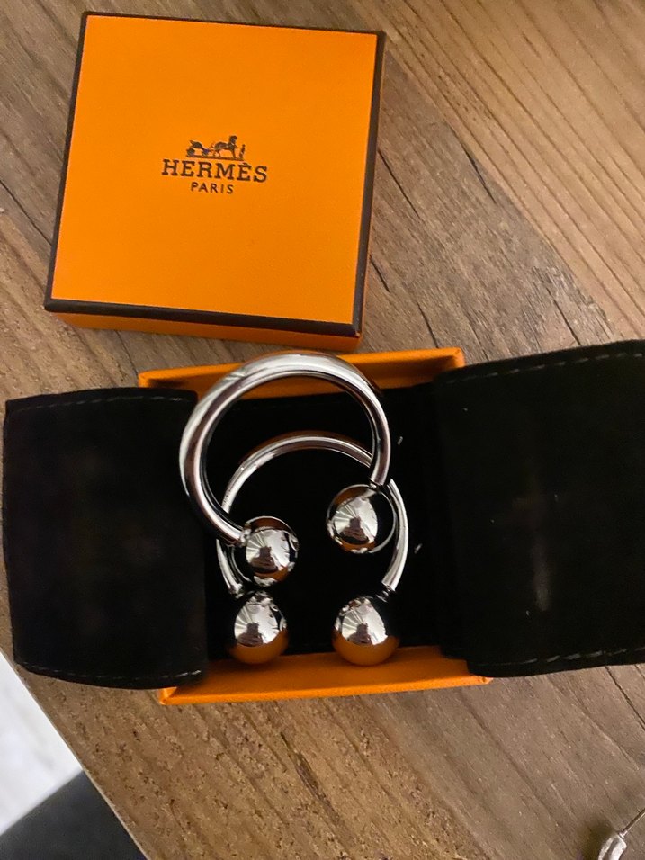Parlak altın renkli Hermès Paris küpe özgün biker tarzı metal halka ve küre detaylarıyla trend belirleyiciler için uygun.
