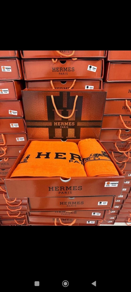 Hermes markalı, parlak camel renkte baskılı havlu seti. Kutusunda, büyük yazılı ve desenli havlular içerir.