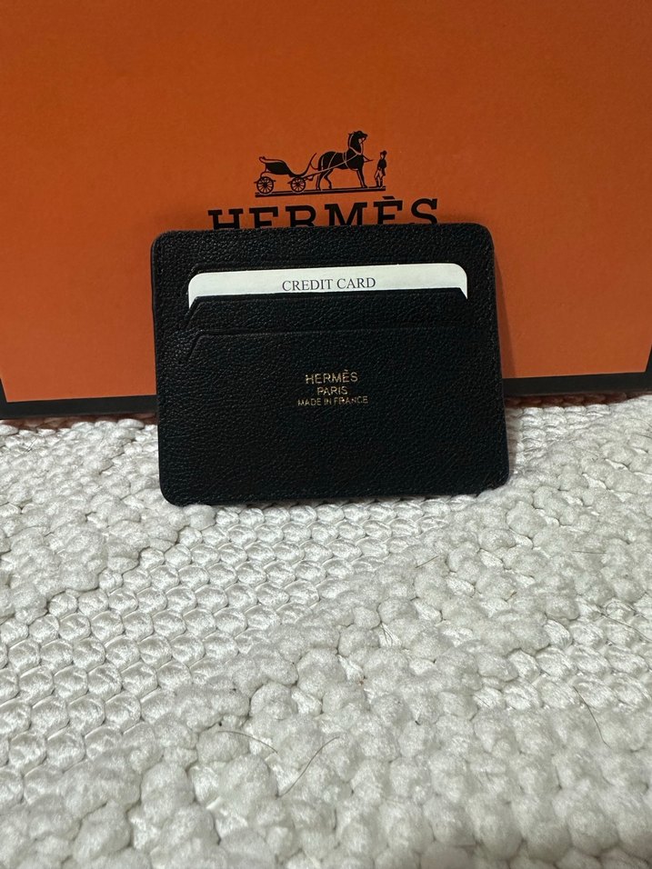 Hermès siyah deri kadın cüzdan, baskılı detaylar günlük kullanım için klasik şıklığı sokak modasıyla birleştirir.