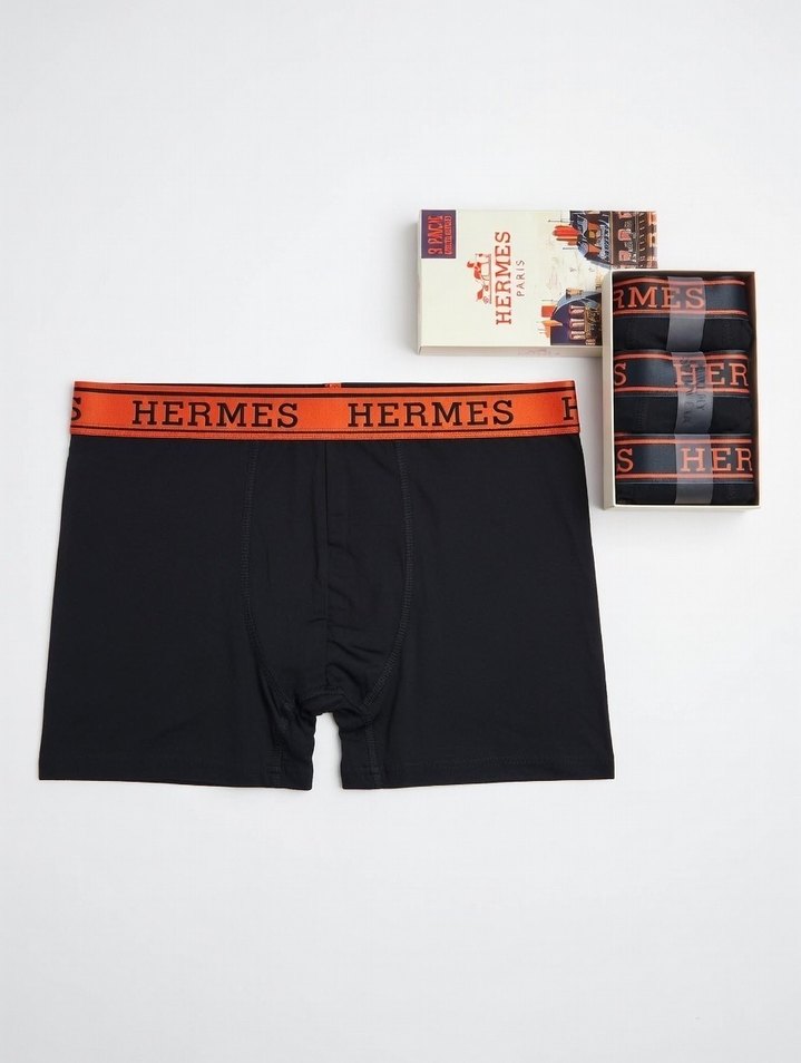 Fitted kesim, baskılı siyah boxer, turuncu Hermes logolu bel bandıyla normal boyda, athleisure tarzında rahat bir model.
