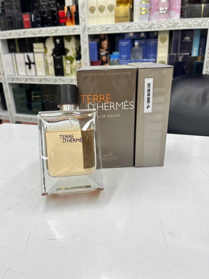 Hermès Terre d'Hermès erkek parfümü, doğal sprey ve çağdaş Paris tarzı ile sunulur. Bej ve gri şık şişe ve kutuda.