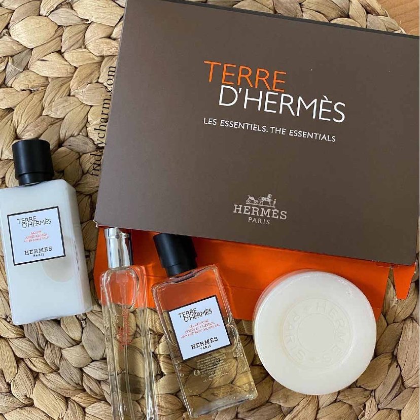 Hermès Terre D'Hermès set, hafif bej tonlarında, çağdaş Paris tarzında erkek parfümü, sabun ve ekstra spreyler içerir.