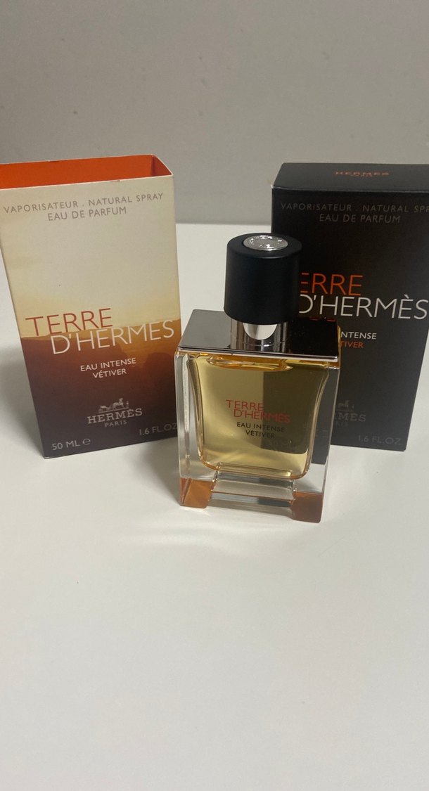 Hermes Terre d'Hermes Eau Intense Vetiver, 50 ml doğal sprey şişede, çağdaş tarzda, canlı koyu bej renkli erkek parfümü. Ürün sıfır hiç kullanılmamıştır orijinal olup jelatinsizdir