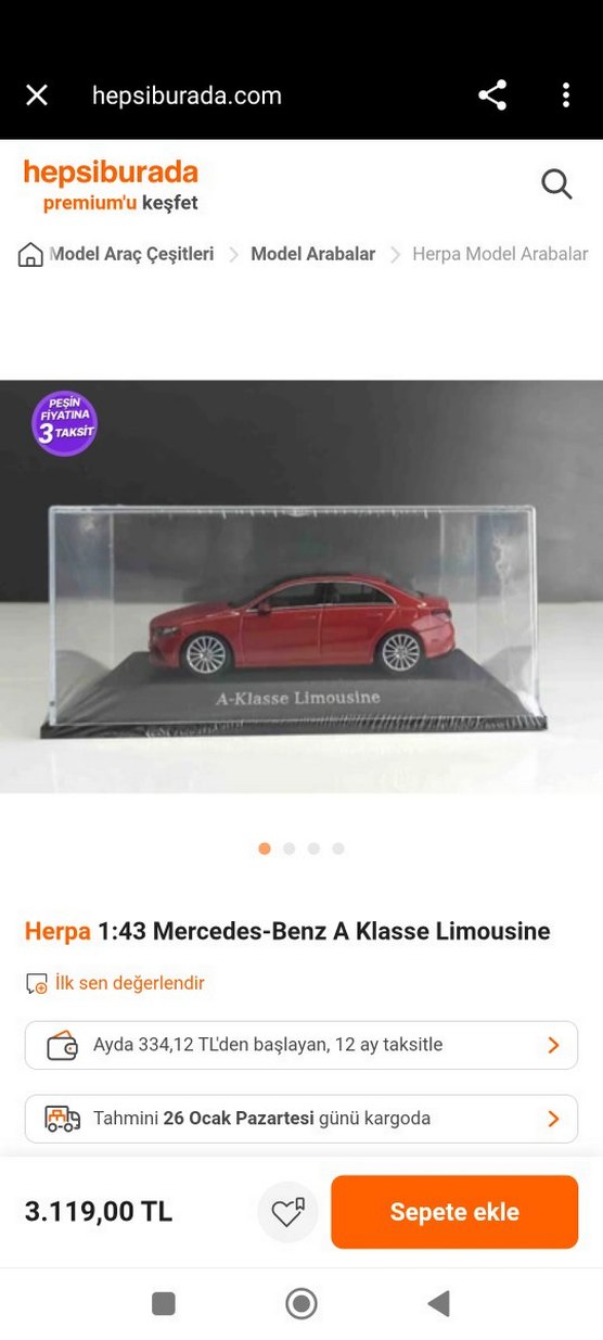Parlak kırmızı renkte, 1:43 ölçekli Herpa Mercedes-Benz A Klasse Limousine model araba, şeffaf kutuda sergilenmektedir.