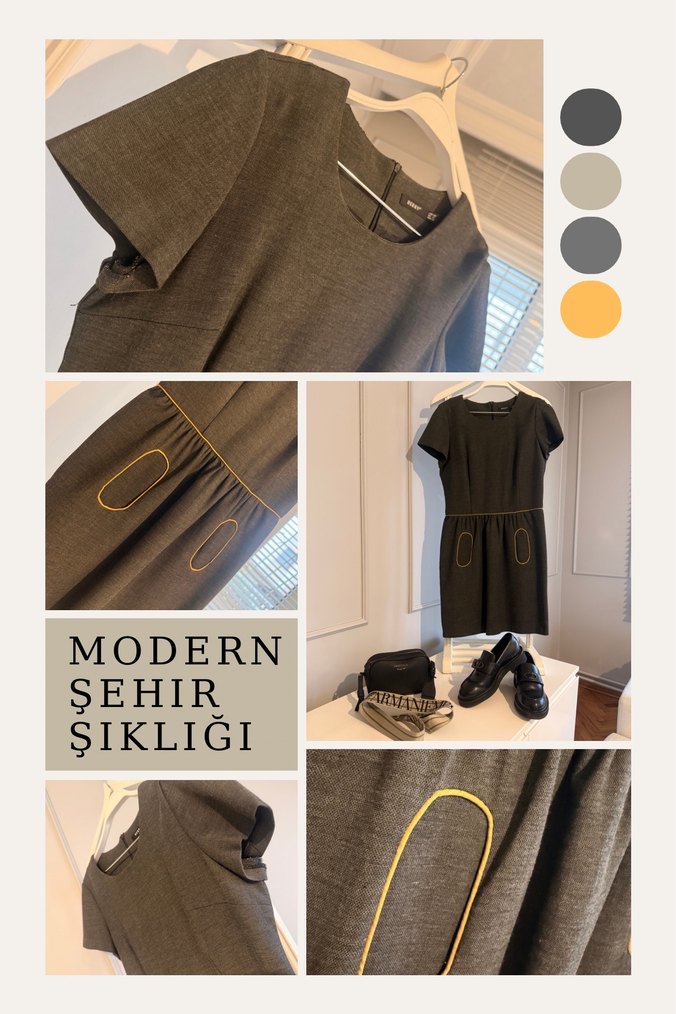 Ofisten Akşam Yemeğine: Kusursuz Form ve Detaylar Gardırobunuzun yeni "kurtarıcı" parçasıyla tanışın. Herry kalitesiyle tasarlanan bu antrasit gri elbise, sofistike rengi ve minimal sarı biye detaylarıyla hem profesyonel hem de stil sahibi bir duruş sergiliyor. • Tasarım & Form: Vücudu nazikçe saran fit kesimi, zarif yuvarlak yakası ve etek kısmındaki modern pile detaylarıyla feminen bir silüet oluşturur. Cep kısımlarındaki özel nakış kontürleri, elbiseye tasarımcı elinden çıkmış bir hava katar. • Kumaş Kalitesi: %44 Polyester, %28 Pamuk ve %22 Viskon karışımı sayesinde formunu korur ve kırışmaz. • Kombin Gücü: İster fotoğraftaki gibi maskülen loaferlar ve çapraz çantalarla günlükleştirin, ister stiletto ile en önemli toplantılarınıza taşıyın. Etiket bedeni 40 olmasına rağmen, kalıbı dardır ve 38 beden giyenler için de kusursuz bir uyum sağlar. Özenle korunmuş, yeniye yakın durumdadır. Teknik Detaylar: • Boy: 90 cm • Omuz: 40 cm • Göğüs: 47 cm • Renk: Antrasit / Koyu Gri