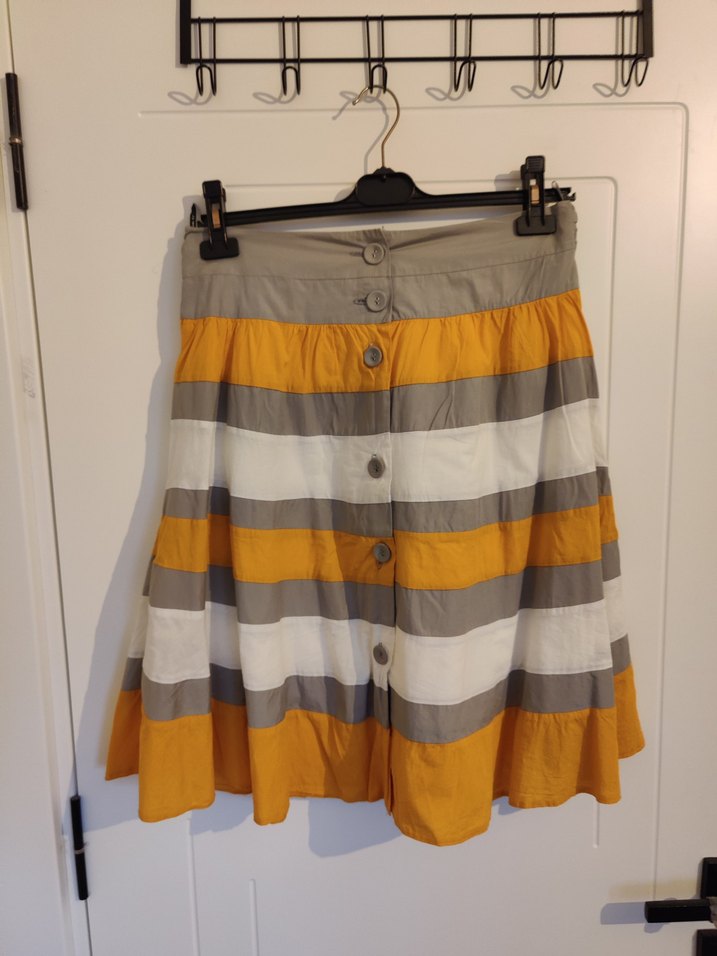 Düğmeli, sarı, gri ve beyaz çizgili, pamuklu kumaştan bohem tarzda rahat midi etek. Günlük kullanıma uygun.