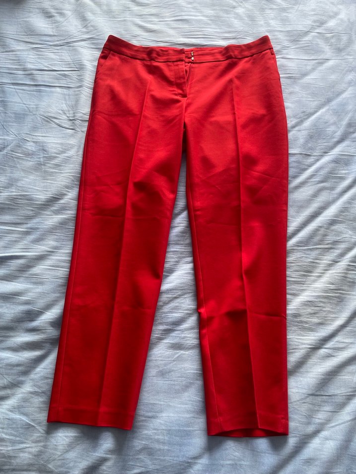 Herry, parlak kırmızı renkte, midi boy, regular fit kadın kumaş pantolon, iş ortamı için uygundur. Beden:44 Boy:94cm Bel:90cm