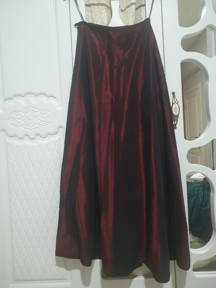 Bordo renkte, uzun ve dökümlü tasarıma sahip, yumuşak ve parlak kumaştan loose fit etek. Gotik stil ve klasik zarafet için uygun.saten tafta yumuşak