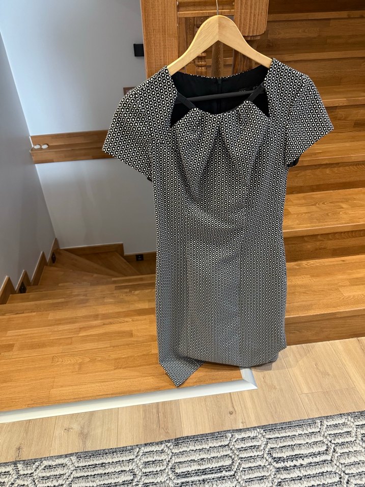 Kısa kollu, V yakalı, kemerli ve baskılı desenli bu gri midi elbise, yumuşak sentetik kumaştan üretilmiştir ve ofis için uygundur. Sadece yaka kısmındaki verilerde dökülme mevcut olup tadilat gerektiriyor bu sebepten fiyatı uygun tuttum