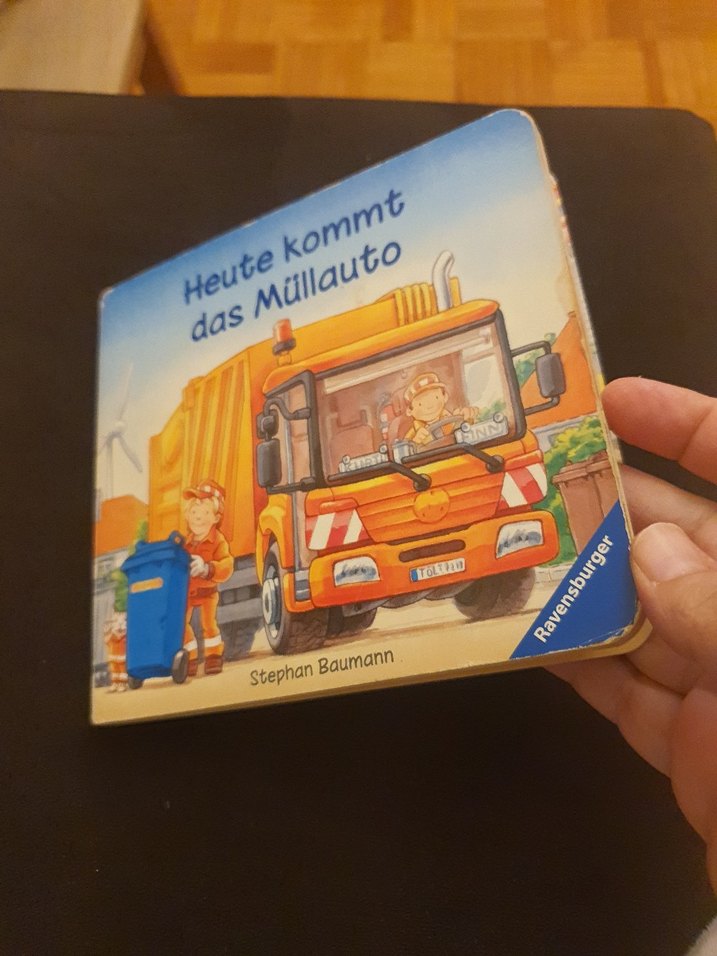 Stephan Baumann'ın yazdığı 'Heute kommt das Müllauto' adlı renkli resimli çocuk kitabı. Kitabın sayfaları kalın kartondandır.