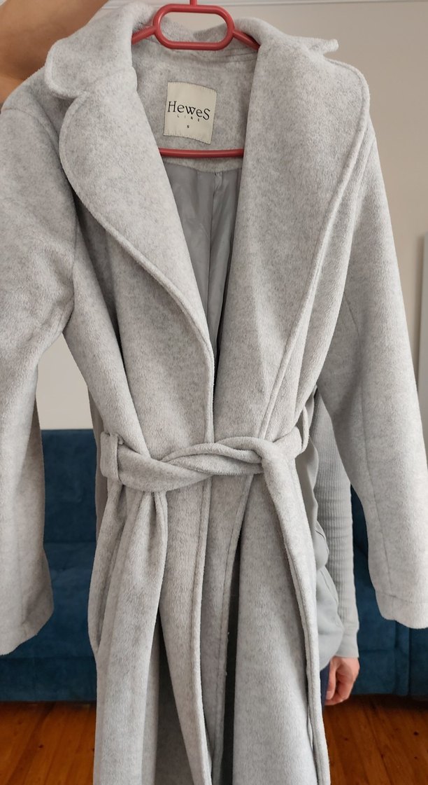 Hewes markalı, yumuşak açık gri kumaştan, kemerli ve astarlı klasik yakalı kaban.