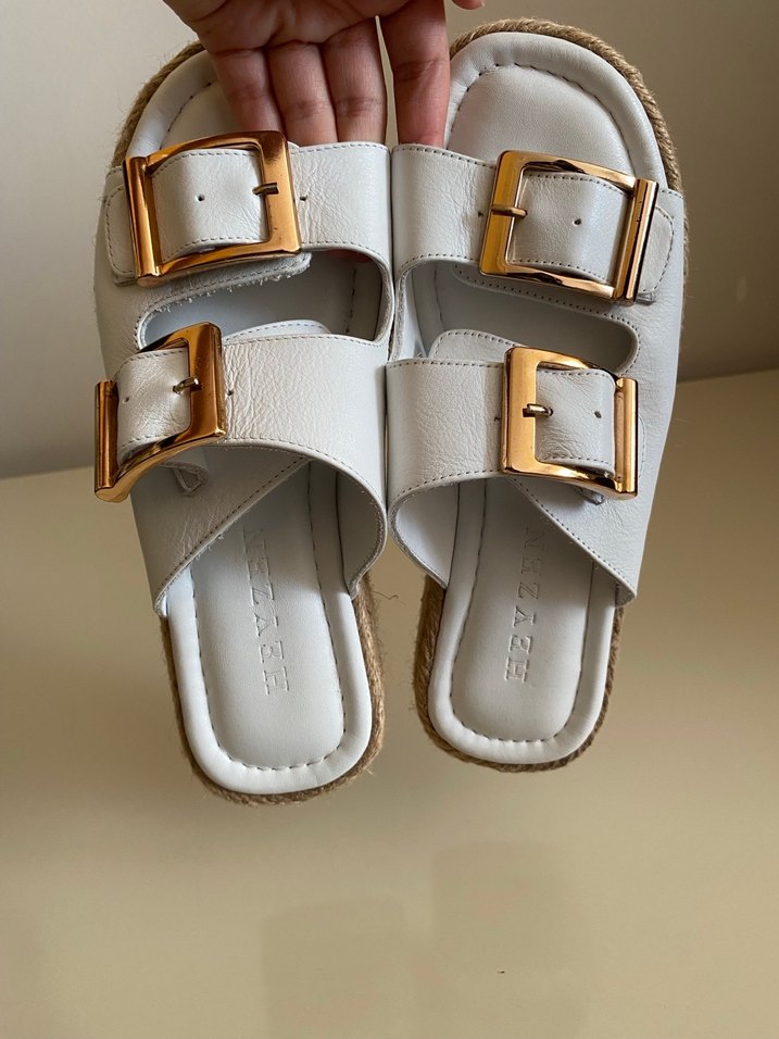 • Tasarım: Ayak üstünü kapatan, iki geniş bant üzerinde altın rengi tokalar bulunuyor. • Taban: Oldukça kalın ve yüksek, iplik/hasır örgü ile kaplanmış bir platform tabana sahip (espadril tarzı). Alt kısmı beyaz, düz bir kauçuk tabanla tamamlanmış. • Renk: Beyaz deriden yapılmış. Bu tarz ayakkabılar genellikle yaz ve bahar aylarında günlük ve rahat giyim için tercih edilir.
