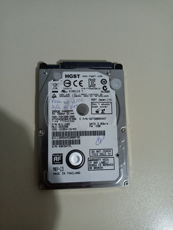 SAĞLIK %100 PERFORMANS YÜZDE 100 HGST 500GB 2.5 inç SATA sabit disk, 5400 RPM hızında, Tayland'da üretilmiştir. Garanti etiketi ve çeşitli sertifikasyon işaretleri bulunur. ⚙️
