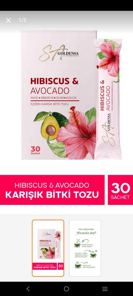 Hibiskus ve avokado içeren, mate, biberiye, cehri ve kızılcık gibi bitkilerden oluşan karışık bitki tozu. 30 adet tek kullanımlık paket halinde.