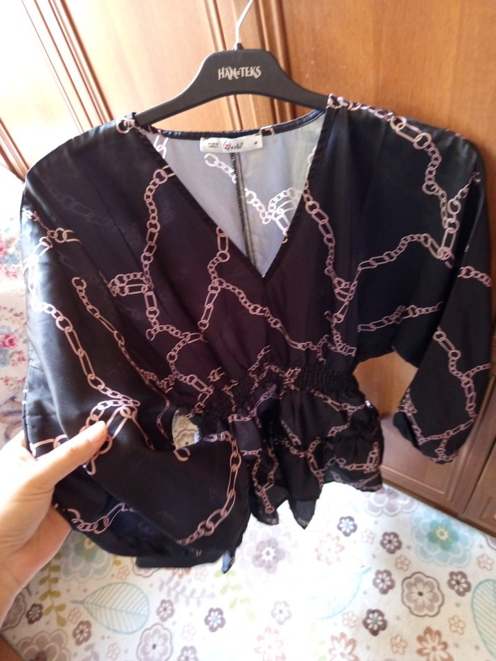 Zincir desenli, V yaka, kısa boy ve bol kesim siyah bluz. İpeksi kumaş ve askılı kollara sahip, sokak modasına uygun.