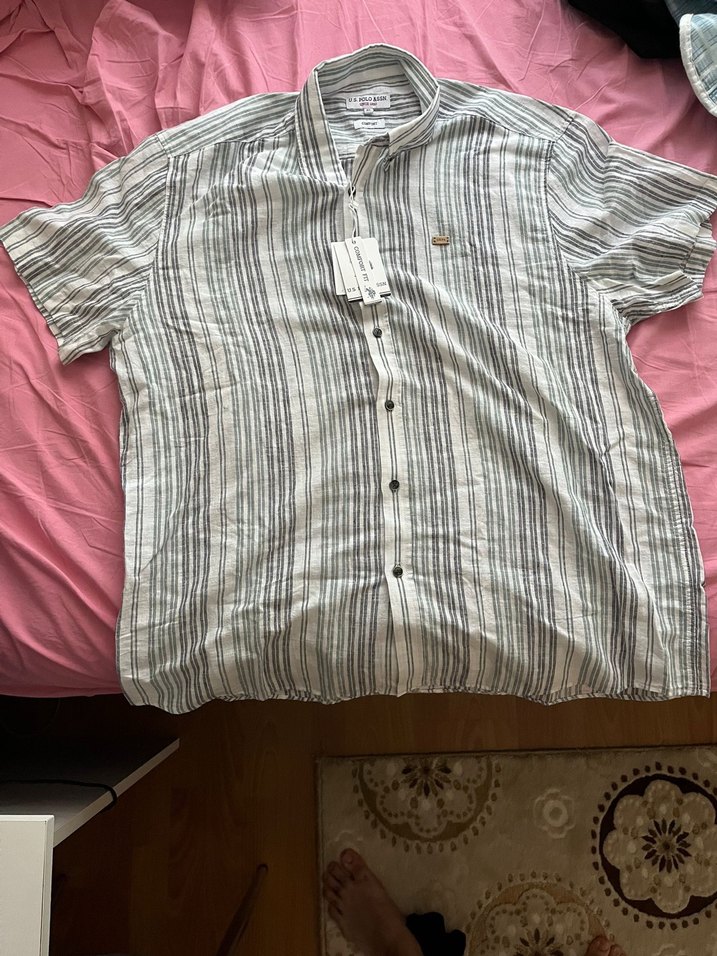 Gri keten kısa kollu gömlek, yakalı ve düğmeli, rahat kullanım için bol kesimlidir.