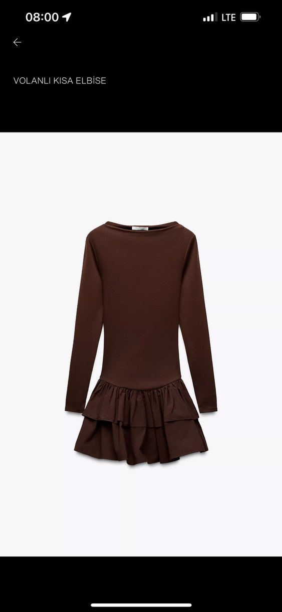 Kahverengi, uzun kollu, bisiklet yaka ve kat kat volan detaylı, vücuda oturan triko elbise. Günlük kullanıma uygun, çağdaş tarzda bir model.