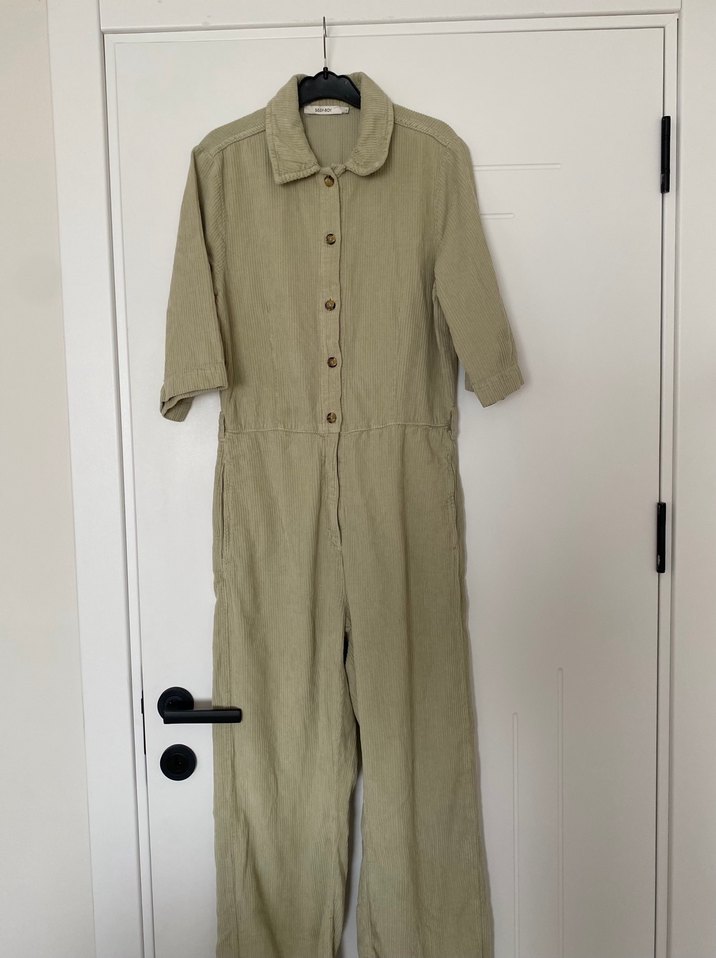 Soft yeşil kadife kumaş, kısa kollu, düğmeli ve yakalı, kadın tulum. Hiç giyilmedi aşırı tatlı ve cool bir tulum bana yakışmadığı için üzülerek satıyorum çok çok güzel kombinlenebilecek bir parça