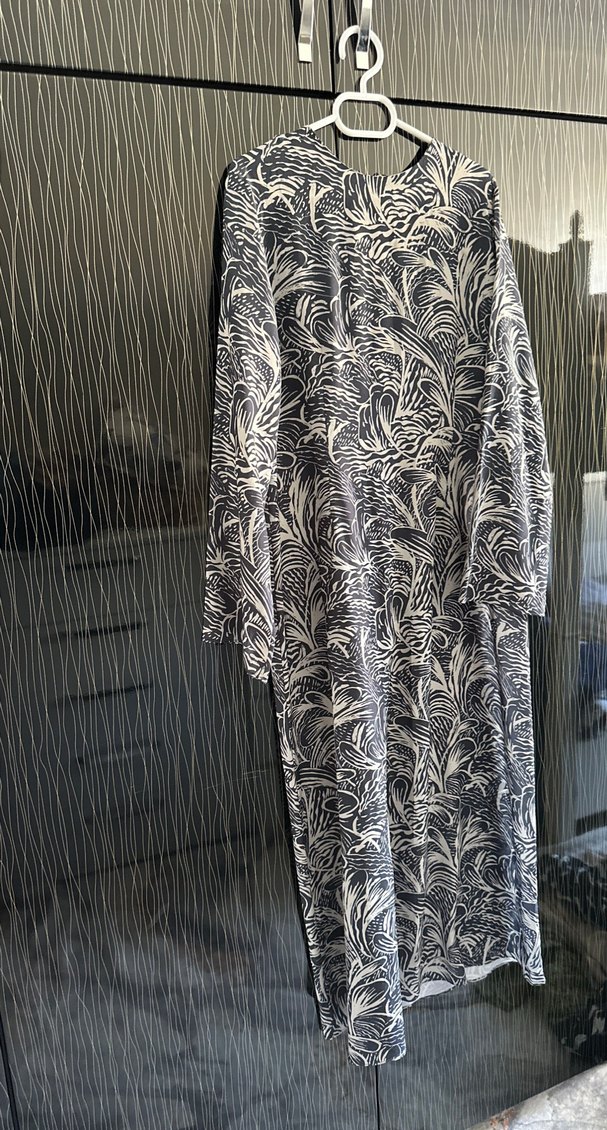 Gri zebra desenli, uzun kollu, bol kesim ve drapeli bohem tarzda uzun elbise. Yaka tipi kayık yaka, günlük kullanım için uygundur. 3 bedendir