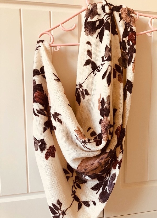 Yenidir sadece etiketi yoktur . Boyun atkısı şeklinde kullanılabilir veya fular olarak da kullanılabilir . Bordo gül kurusu çiçek detayları vardır.