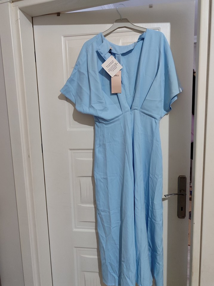hiç kullanılmamış Mavi V Yakalı Uzun Kadın Elbise