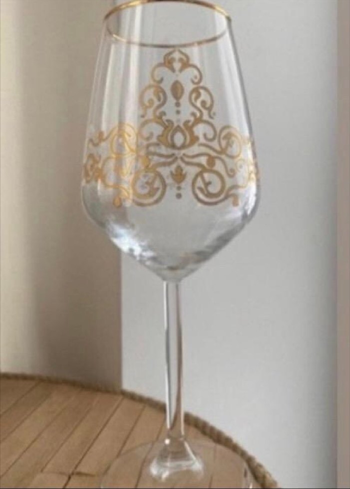 Karaca Parlak altın işlemeli desenler ve altın kenar detaylı uzun ayaklı şık kadeh. Elimde 11adet var biri taşınma sırasında kırıldı. Hiç kullanılmadı.