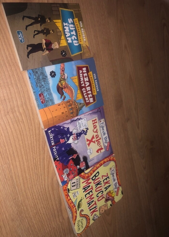 4 adet hiç yıpranmamış ve okunmamış ucuz kitaplar ; Sütçü İmam / 120 sayfa Hezarfen Ahmet Çelebi /136 sayfa Eğlenceli Bilgi Hayalet X / 144 sayfa Eğlenceli Bilgi Zekası Bükücü Matematik/ 208 sayfa . Bu 4 yeni kitap sadece 150 TL ! Ben bir ortaokul öğrencisiyim ve bu tür kitaplar okumuyorum 2 adet kitap yaşıma küçük geldiği için diğer 2 kitap da matematik ile alakalı olduğu için kitaplığım da öylece duruyordu ben de neden olduğundan daha ucuza satıp kendi harçlığımı çıkartmayayım dedim . Olduğundan çok daha ucuza satıyorum bu nedenle pazarlık ve takas istemiyorum .