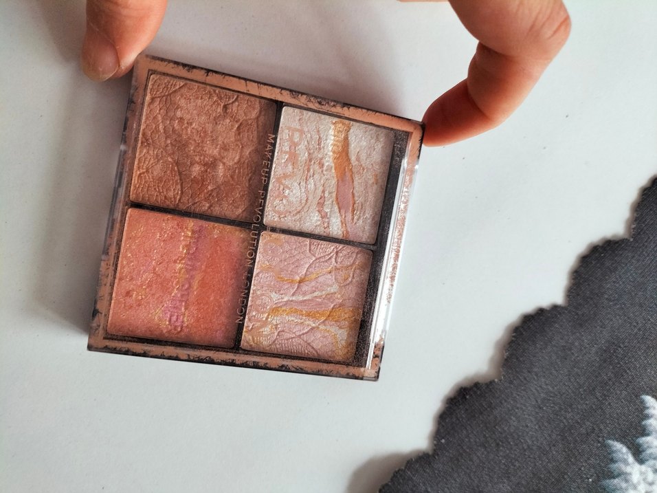 Işıltılı bitişli, açık bej tonlarında highlighter paleti, doğal makyaj için uygundur.