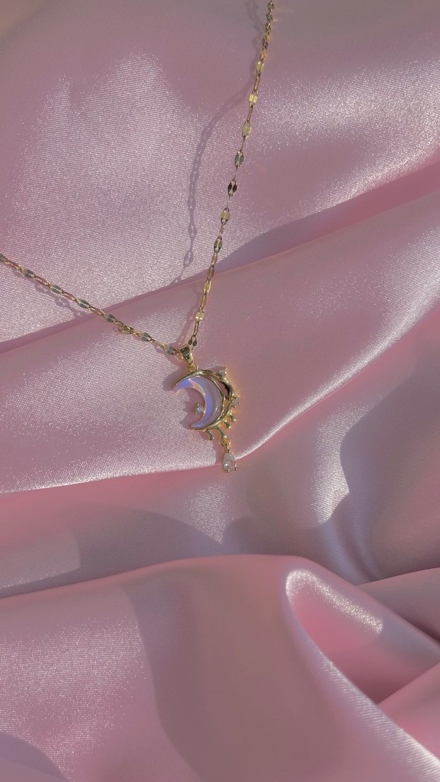 Hologramlı lila ve mavi yansımalı eriyen hilal figür kolyemiz çeliktir, kararma solma yapmaz
