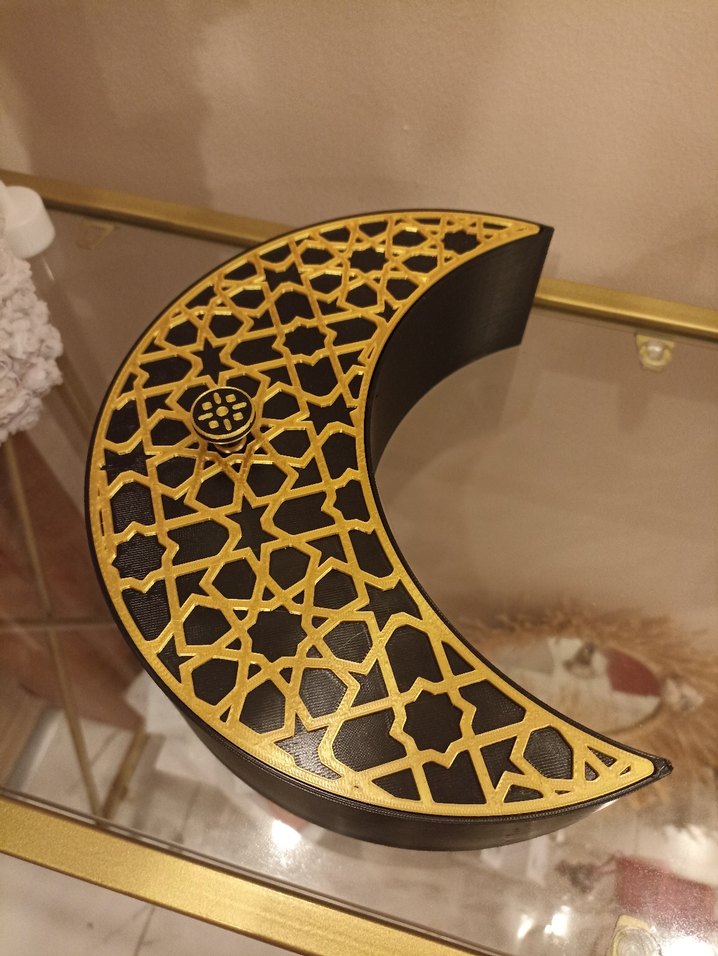 Hilal şeklinde, siyah zemin üzerine altın desenlerle Osmanlı tarzını yansıtan dekoratif