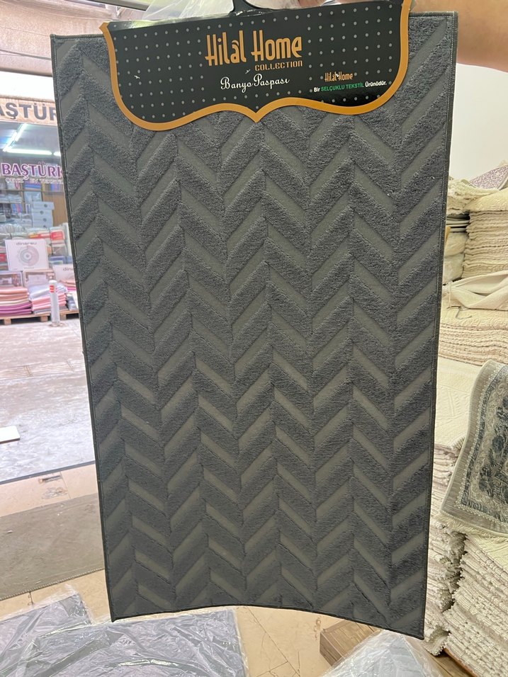 HilalHome'dan gri renkli, desenli banyo paspası, yumuşak ve emici yüzey sunar.