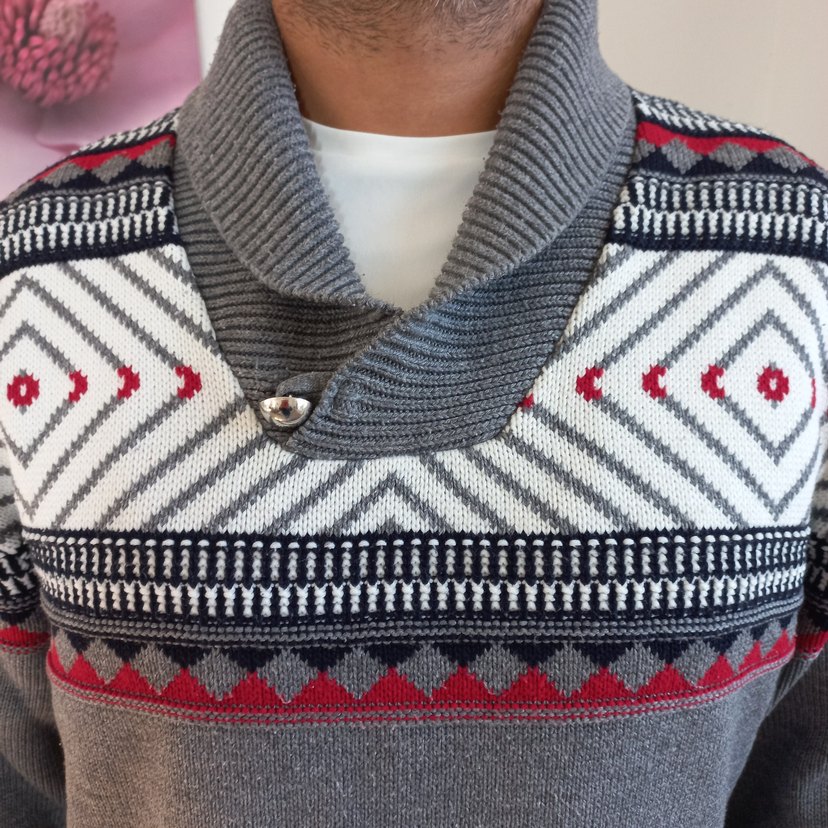 Ürün makeni ölçüleri omuzdan omuza 48 cm kol boyu 60 cm bel 50 cm sırt boy 70 cm kalıp L/ M bedenede uyugundur Bu erkek kazak, düğmeli yüksek yaka ve gri, kırmızı, siyah nakışlı desenlere sahiptir. Yumuşak örme kumaştan, regular fit ve uzun kolludur, gündelik kullanıma uygundur.