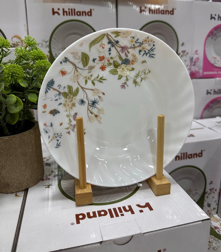 Hilland markalı beyaz tabak, zarif çiçek desenleriyle süslenmiştir ve yemek sunumuna şıklık katar. ️