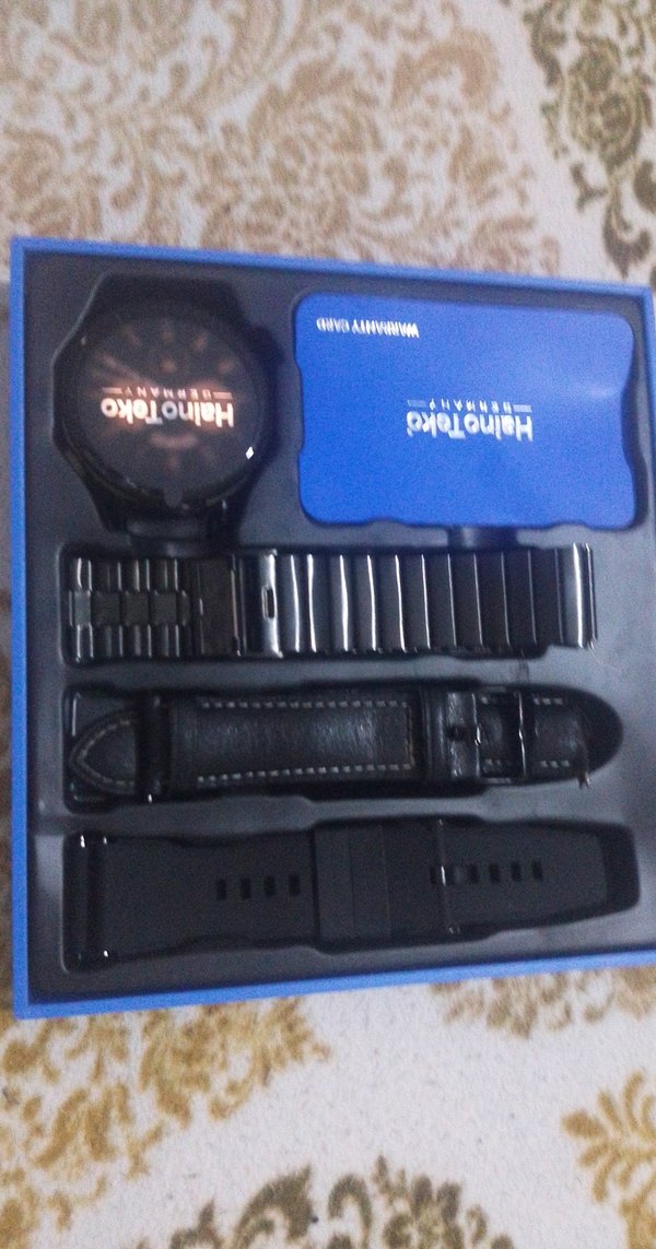 Himotecko siyah akıllı saat, metal, deri ve silikon kayış seçenekleriyle birlikte gelir. Mavi kutuda sunulur. ⌚