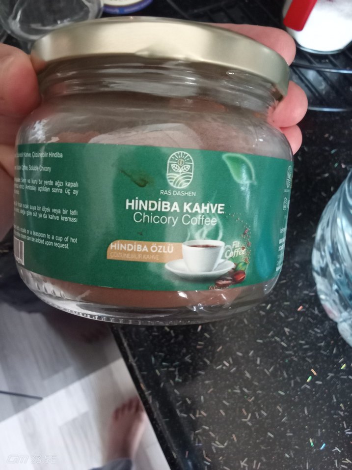 Cam kavanozda, metal kapaklı hindiba aromalı kahve içerir. Hindiba Kahve olarak etiketlenmiştir sadece 5 kez kullandım %90 dolu Dr içmemi uygun görmedi