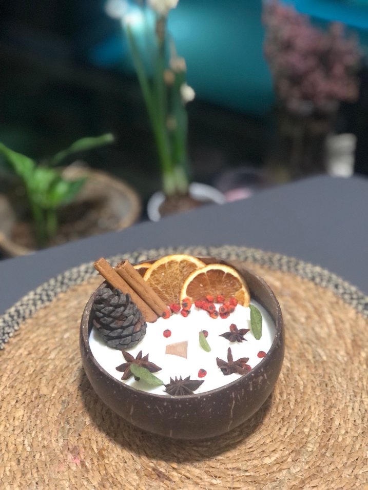 Kahverengi Hindistan cevizi doğal kase içinde tarçın çubukları, kuru portakal dilimleri, kozalak ve yıldız anasonu ile sıcak ve baharatlı bir koku sunan mum. ️