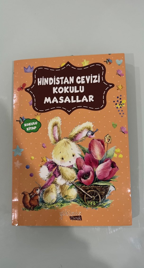 Hindistan cevizi kokulu çocuk masalları kitabı, sevimli tavşan ve çiçeklerle süslenmiş. Kokulu kitap olarak çocukların ilgisini çeker.