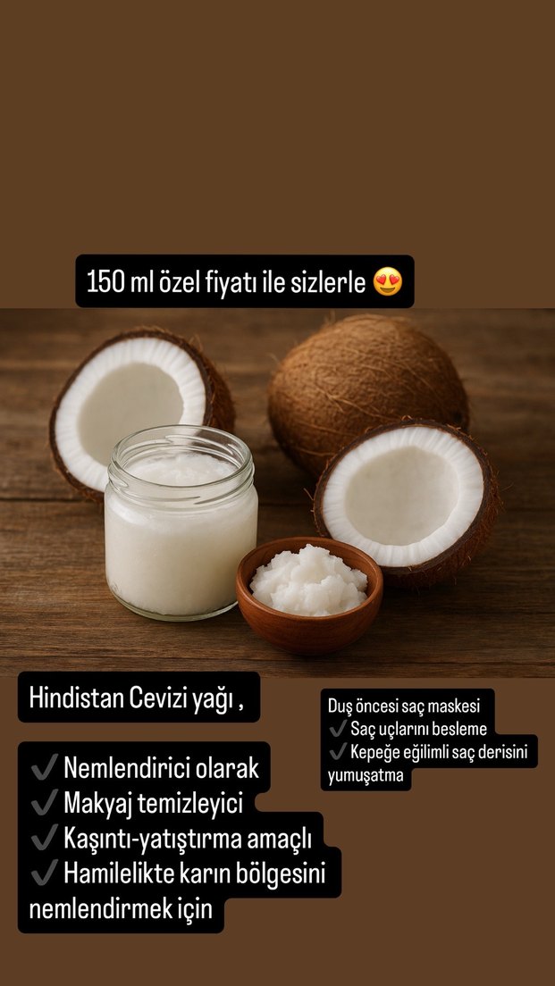150ml Hindistan cevizi yağlı balm nemlendirici, yumuşatıcı ve kaşıntı yatıştırıcıdır. Makyaj temizleyici, saç ucu besleyici, kepeğe eğilimli saç derisi ve hamilelikte karın bölgesi için uygundur.