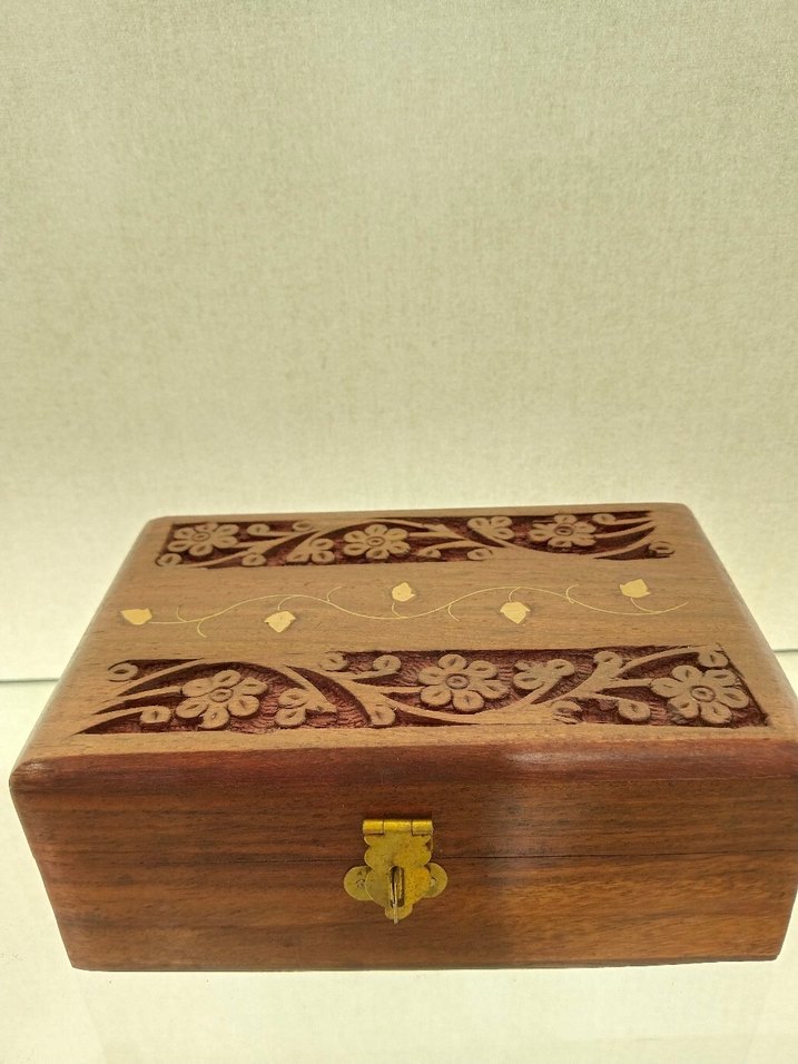 Kahverengi ahşap kutu, detaylı çiçek oyma süslemeleri ve kilitli kapak içerir. Renkli ve dekoratif bir ahşap oyuncak aksesuarıdır. 18x13 cm ebatlarında Hint işi el emeği ürün sıfır olup kendi kutusunda gelir ithal ürün dür