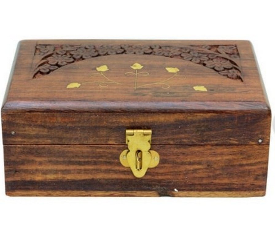 Koyu kahverengi ahşap oyuncak kutusu, detaylı oymalar ve kapakta çiçek desenli kakma ile süslenmiştir. Hint işi el emeği kaliteli ahşap tan üretilmiştir pirinç çakma dir 15x10x6 cm ebatlarında ürün sıfır olup kendi kutusunda gelir ithal ürün sıfır