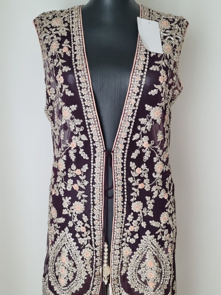 Hindistan dan Mürdüm renk,Yavruağazı detaylı ,gümüş renk taşlarla bezeli uzun yelek .Cm ölçü görselde ekli. Ürün taşlarla süslü olduğu için ağırdır.