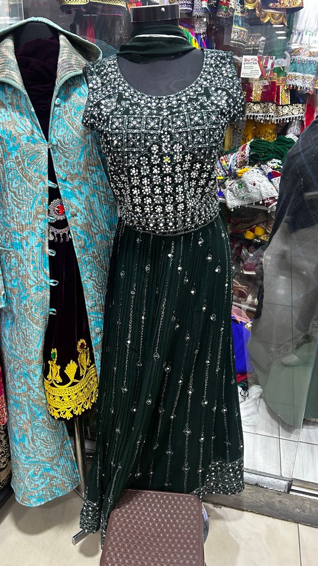 V yakalı, boncuk ve işlemeli detaylara sahip, uzun ve dar kesim kolsuz bohem tarzda çok renkli koyu elbise. Düğünler için uygundur.