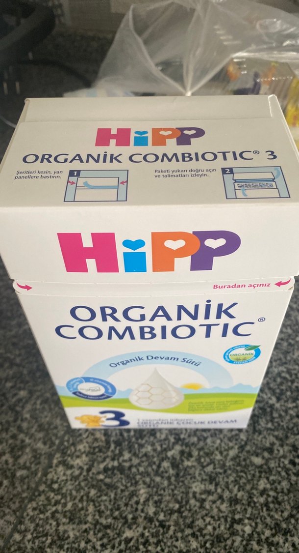 Hipp Organik Combiotic 3, bebekler için organik devam sütü formülüdür. Açma talimatları bulunan açık renkli pakette sunulmuştur.