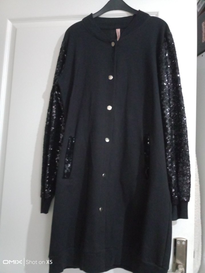 Uzun siyah kadın, düğmeli ve kol kısmı parlak payet detaylıdır. Rahat kesim ve notlu yakalı, sentetik kumaştan rahat ve gündelik goth tarzındadır. spor hırka