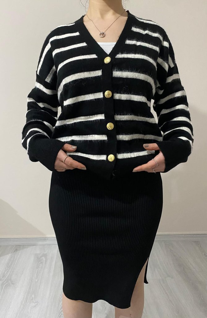 Düğmeli, siyah beyaz zebra desenli, uzun kollu, ince triko hırka. Midi boy ve dar kesim, günlük sokak stiline uygun.
