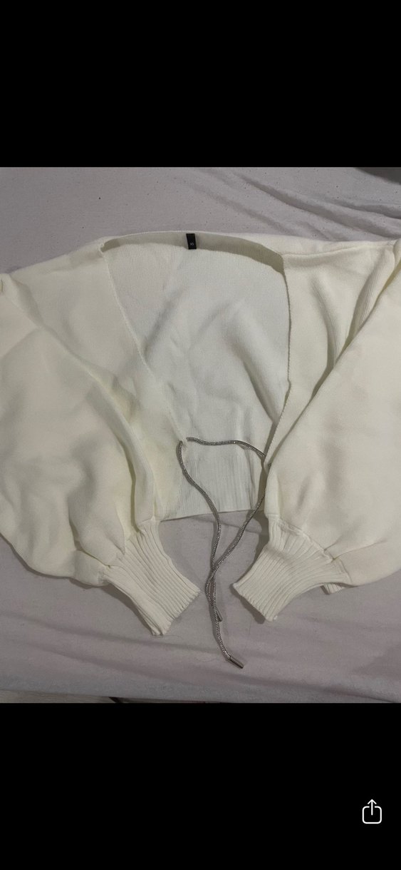 Beyaz, yuvarlak yakalı ve uzun kollu kadın hirka. Salaş kesimi ve drapeli tasarımıyla rahat ve şık bir görünüm sunar.