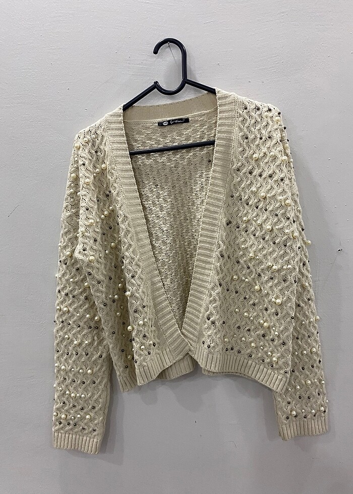 Boncuklu hırka. Birkaç boncuğunda kopma var. Yurt dışından geldiği içim bedeni hakkında bilgim yok . Ancak L bedene kadar olur