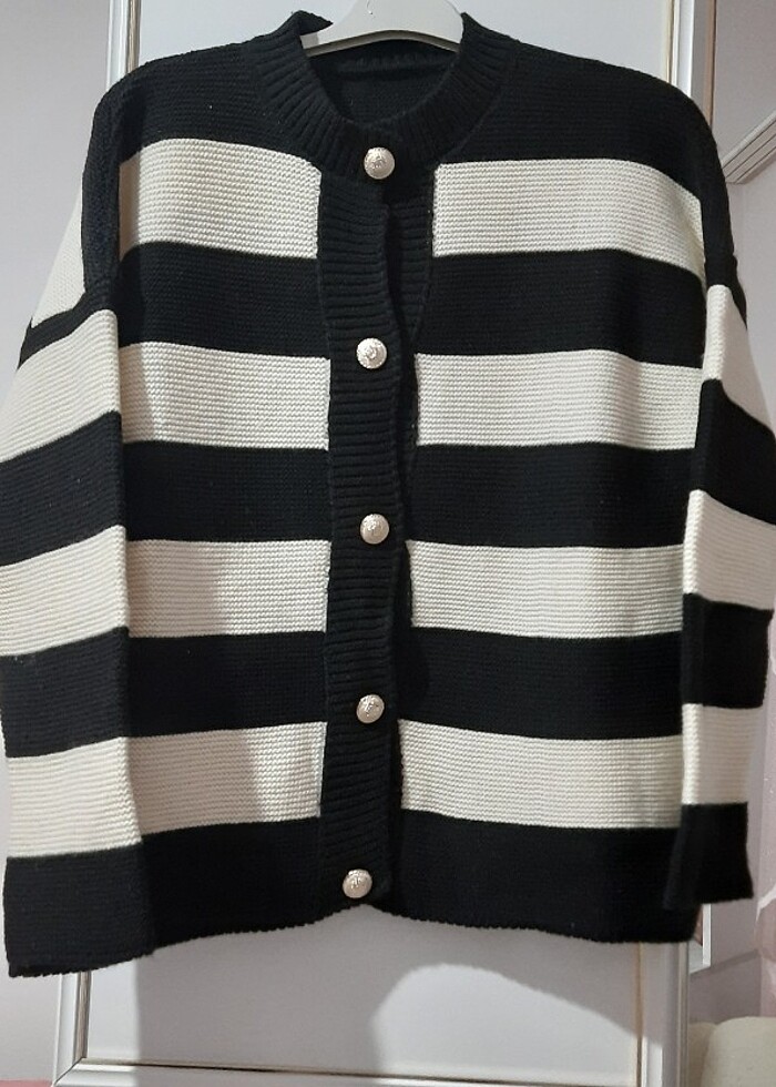Kazak görünümlü gold detaylı hırka modeli çizgili siyah ve krem renklerinden oluşuyor giyinilmedi