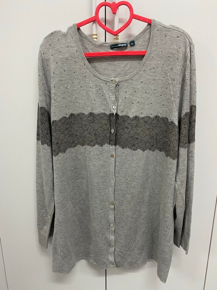 Gri örgü kumaştan, bisiklet yaka ve uzun kollu, bol kesim midi uzunlukta kadın hırka. Göğüs kısmında ince desenli bant bulunur, günlük kullanıma uygundur. 73 cm uzunluğunda xl beden az kullanıldı sorunsuz